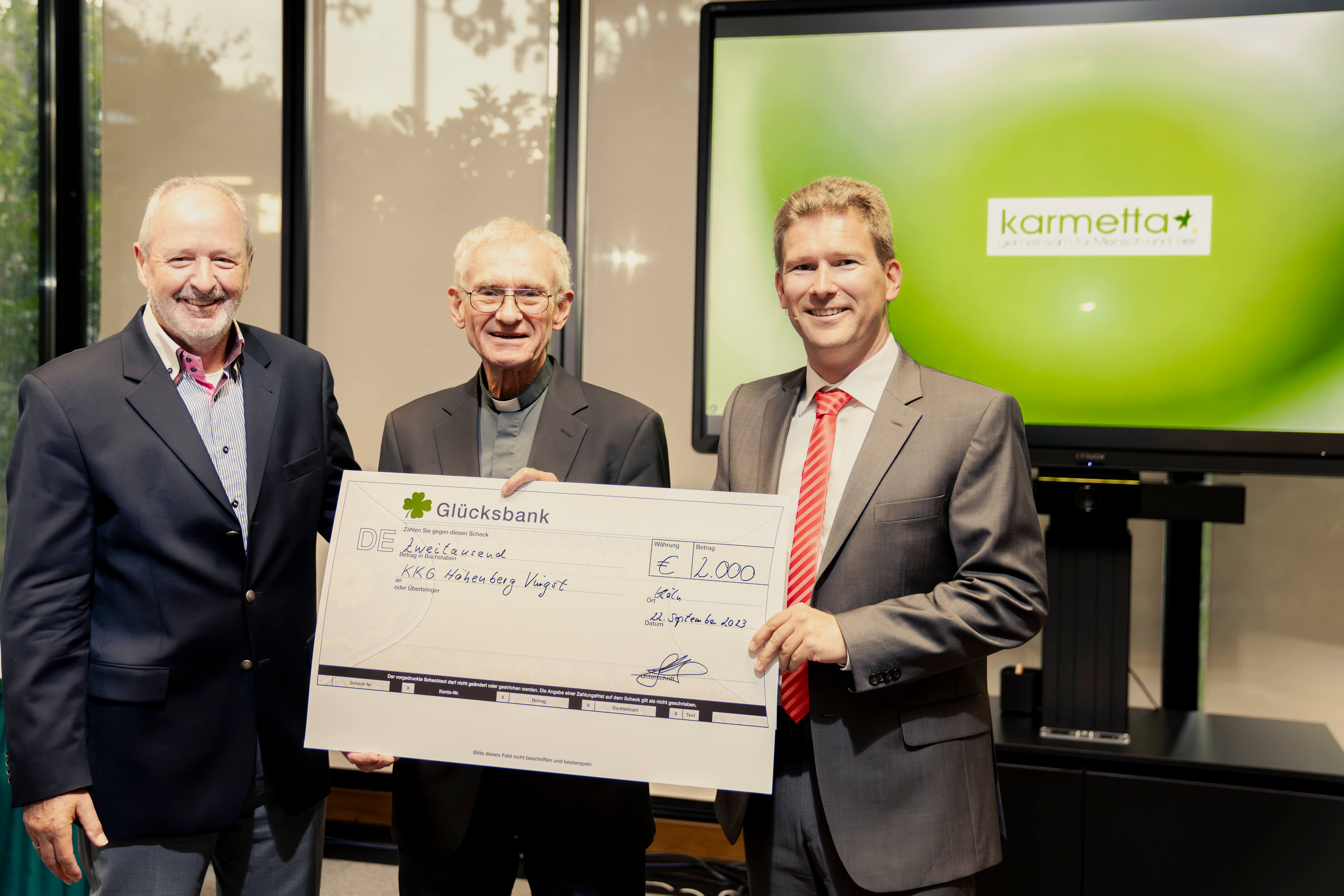 v.l.n.r.: P. Epper (Mitglied des Kuratoriums der Karmetta-Stiftung), Pfarrer F. Meurer (Preisträger 2023), Dr. S. Haas (stellvertretender Vorsitzender der Karmetta-Stiftung)